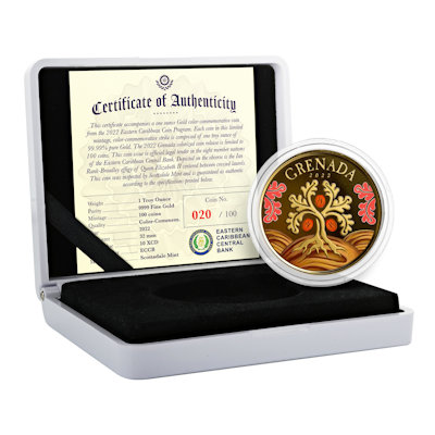 Die Scottsdale Mint verausgabt mit der Eastern Caribbean Central Bank (ECCB) das EC8-Programm. Es handelt sich mit den Ausgaben 2022 bereits um die 5. Ausgabe dieser wunderschönen Serie. Die zweite Ausgabe der 2022er Serie kommt aus Grenada und zeigt den Muskatnussbaum (Nutmeg Tree).