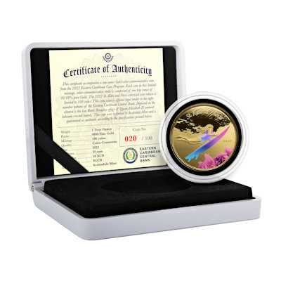 Technische Daten: Ausgabeland: Karibik Inseln Prägeanstalt: Scottsdale Mint Ausgabejahr: 2022 Nennwert: 10 Dollar Material: Gold Gewicht: 31,10300g Durchmesser: 38,60 mm Auflage: 100 Stück Prägequalität: Polierte Platte, coloriert Verpackung: Gekapselt im Original-Etui mit Umverpackung und nummeriertem Echtheitszertifikat |