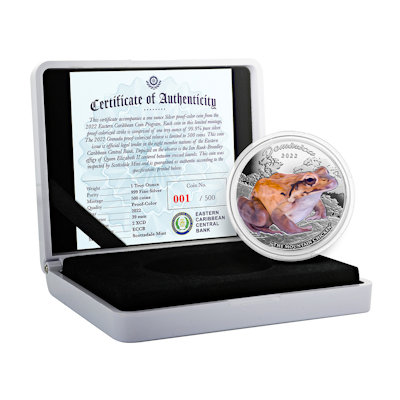 <<< Dominica - 2 Dollar EC8_5 Mountain Chicken / Berghuhn (Froschlurch) PP 2022 - 1 Oz Silber Color | |