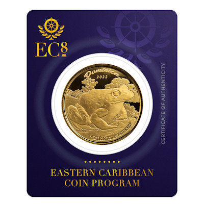 <<< Dominica - 10 Dollar EC8_5 Mountain Chicken / Berghuhn (Froschlurch) 2022 - 1 Oz Gold | |