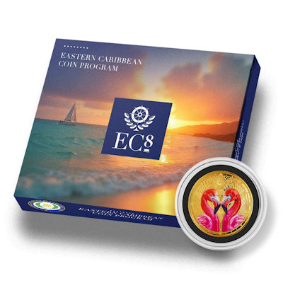 Die Scottsdale Mint freut sich, in Zusammenarbeit mit der Eastern Caribbean Central Bank (ECCB) das EC8-Programm mit der Veröffentlichung der Ausgabe St.Lucia Flamingos in 1 Oz Feingold Proof Like coloriert fortzusetzen.