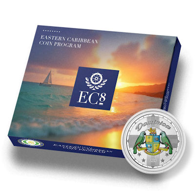 Die EC8 Serie wird von Dominica mit dem Motiv Coat of Arms fortgesetzt. Die 1 Oz Feinsilbermünze in Stempelglanz Proof Like mit aufwendiger Kolorierung hat eine Auflage von 500 Stück weltweit.