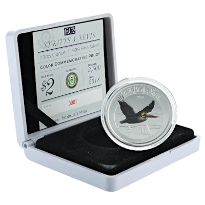 <<< St. Kitts und Nevis - 2 Dollar EC8 Brauner Pelikan PP - 1 Oz Silber Color | |