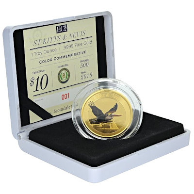 <<< St. Kitts und Nevis - 10 Dollar EC8 Brauner Pelikan PP - 1 Oz Gold Color | |