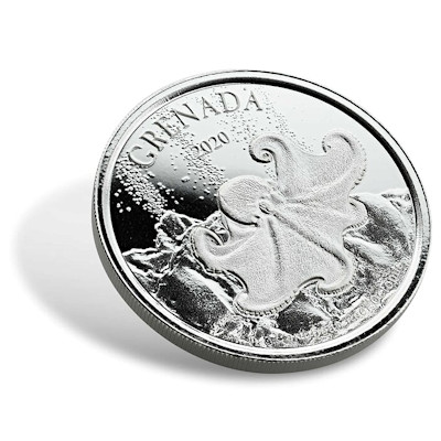 Die Scottsdale Mint freut sich, in Zusammenarbeit mit der Eastern Caribbean Central Bank (ECCB) das EC8-Programm mit der Veröffentlichung der Silber- und Goldmünzen Grenada Octopus 2020 fortzusetzen. Die Münze zeigt den Caribbean Reef Octopus, eine in der östlichen Karibik heimische Oktopusart, die über den Meeresboden gleitet. Im Hintergrund sprudeln Blasen aus den hydrothermalen Quellen des Unterwasservulkans Kick Em Jenny ein Wahrzeichen von Grenada. Es handelt sich hier um die Ausgabe in 1 Oz Feinsilber in Stempelglanz, einzeln gekapselt.