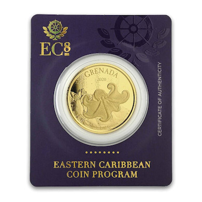 Die Scottsdale Mint freut sich, in Zusammenarbeit mit der Eastern Caribbean Central Bank (ECCB) das EC8-Programm mit der Veröffentlichung der Silber- und Goldmünzen Grenada Octopus 2020 fortzusetzen. Die Münze zeigt den Caribbean Reef Octopus, eine in der östlichen Karibik heimische Oktopusart, die über den Meeresboden gleitet. Im Hintergrund sprudeln Blasen aus den hydrothermalen Quellen des Unterwasservulkans Kick Em Jenny ein Wahrzeichen von Grenada. Es handelt sich hier um die Ausgabe in 1 Oz Feingold verpackt und sicher geschützt in Certi-Lock(R) Verpackung!