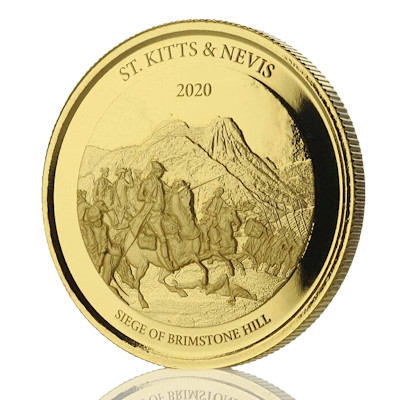 Die 2020 ECCB Ausgabe von St. Kitts & Nevis zeigt die Belagerung von Brimstone Hill, der größten Festung, die jemals in der Karibik gebaut wurde. Die Münze zeigt die französischen Soldaten, die 1782 während des amerikanischen Unabhängigkeitskrieges die Küste von Saint Kitts stürmten. Obwohl die Briten fast dreimal zahlenmäßig unterlegen waren, dauerten es einen Monat, bevor sie sich ergaben. Ungefähr ein Jahr später stellte der Vertrag von Paris St. Kitts und das angrenzende Nevis wieder unter britische Herrschaft. Diese Festung ist heute ein UNESCO-Weltkulturerbe und ein sehr beliebtes Touristenziel.