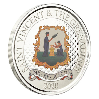 Die Ausgabe St. Vincent und Grenadinen zeigt in der EC8_3 Serie mit Jahrgang 2020 das Motiv Pax et Justitia. Der Hintergrund enthält ein hübsches Rautenmuster, das St. Vincent und die zentrale Lage der Grenadinen huldigt - einzigartig gelegen mit St. Lucia im Norden, Barbados im Osten, Grenada im Süden und dem Karibischen Meer im Westen. Der äußere Rand der Münze zeigt das Land und das Jahr in einer zeitlosen, großgeschriebenen Serifenschrift.
