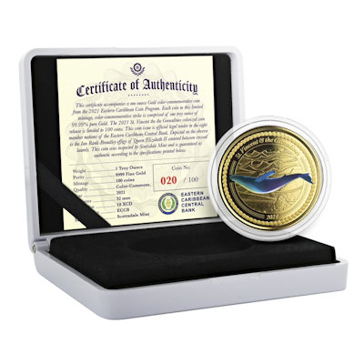 Die Scottsdale Mint freut sich, in Zusammenarbeit mit der Eastern Caribbean Central Bank (ECCB) das EC8-Programm mit der Veröffentlichung der Ausgabe St. Vincent und Grenadinen 2021 Humpback Whale fortzusetzen. Es handelt sich hier um die Ausgabe in 1 Oz Feingold in der höchsten Prägequalität Poliert Platte, gekapselt im Original-Etui mit Umverpackung und nummeriertem Echtheitszertifikat. Die Ausgabe ist auf nur 100 Stück streng limitiert. Es handelt sich um die 6. Ausgabe der 4. EC8 Serie.