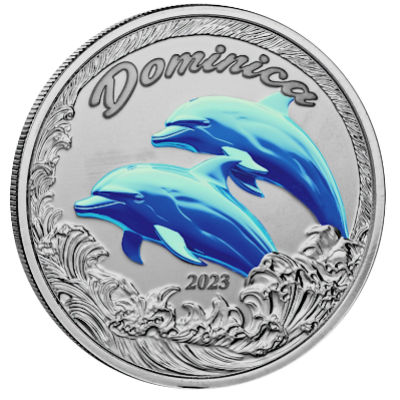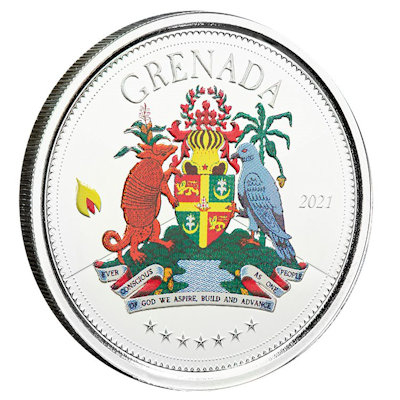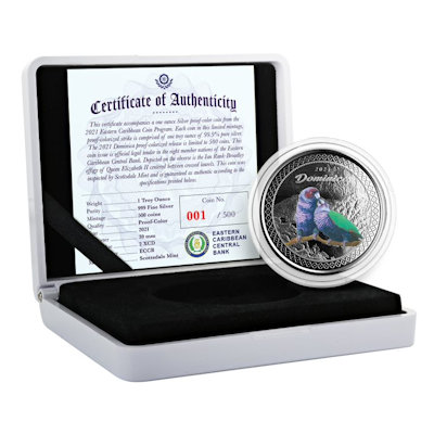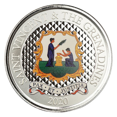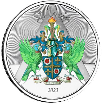 Die EC8 Serie wird von Dominica mit dem Motiv Coat of Arms fortgesetzt. Die 1 Oz Feinsilbermünze in Stempelglanz Proof Like mit aufwendiger Kolorierung hat eine Auflage von 500 Stück weltweit. |