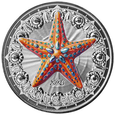Die EC8 Serie wird von Montserrat mit dem Motiv Starfish fortgesetzt. Die 1 Oz Feinsilbermünze in Stempelglanz Proof Like mit aufwendiger Kolorierung hat eine Auflage von 500 Stück weltweit. |