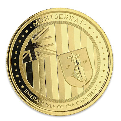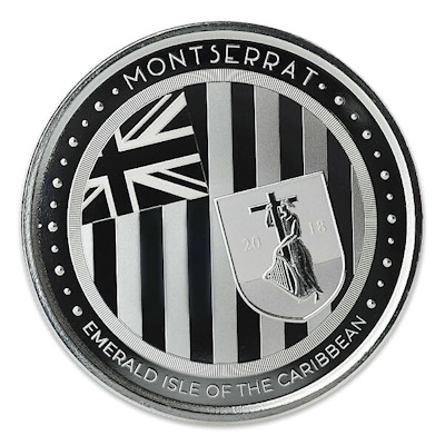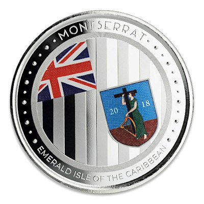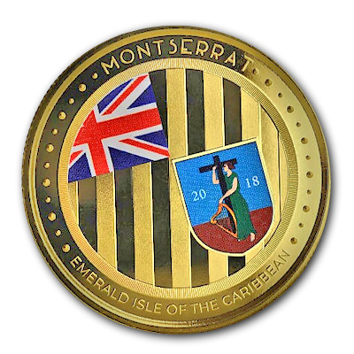 Die 5. Ausgabe der EC8 Serie kommt aus Montserrat. Das Motiv der Münze zeigt die Landesflagge von Montserrat, eine blaue Flagge mit der britischen Unionsflagge und das Wappen von Montserrat. Das Wappen besteht aus einem Schild mit einer grünen Dame, die Erin darstellt. Die weibliche Personifikation Irlands hält eine goldene Harfe in einem Arm, während sie mit dem anderen Arm das Kreuz umarmt, dass das Christentum symbolisiert. Montserrat liegt auf den Leeward-Inseln der östlichen Karibik, die Teil der als Kleine Antillen bekannten Kette in Westindien ist. Es ist ein britisches Überseegebiet, dessen Spitzname `The Emerald Isle of the Caribbean` aus seiner Ähnlichkeit mit der Küste Irlands und der irischen Abstammung vieler Einwohner stammt. |