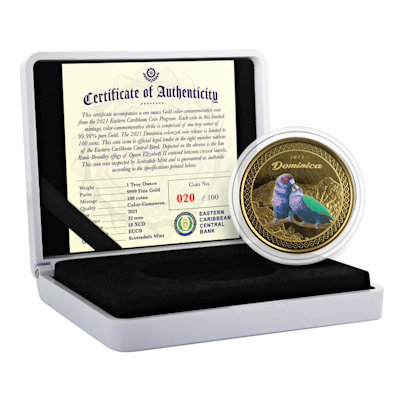 Die EC8 Serie wird von Dominica mit dem Motiv Coat of Arms fortgesetzt. Die 1 Oz Feingoldmünze in Stempelglanz hat eine Auflage von 2.500 Stück weltweit. |