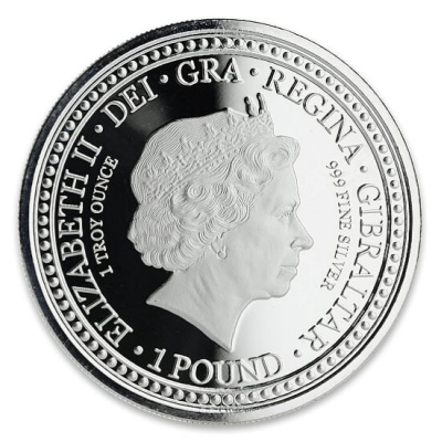 Es handelt sich hier um die Variante in 1 Oz Feinsilber in der Prägequalität Stempelglanz Brilliant Uncirculated (BU). Limitiert auf nur 50.000 Stück, ausgegeben von Gibraltar mit einem Nennwert von 1 Pfund (GBP).