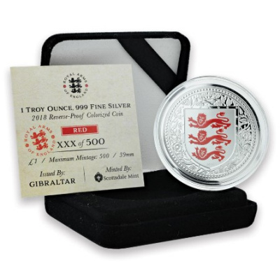 Von der Scottsdale Mint produziert und von Gibraltar Ausgegeben erscheint diese umfassende Serie mit den Royal Arms of England, also dem englischen 3 Löwen Wappen. Die Serie umfasst die Ausgabe in 1 Oz Feinsilber BU (limitiert auf 50.000 Stück) sowie in 1 Oz Feingold BU (5.000 Stück) und in 1/5 Oz Feingold BU (5.000 Stück). Als Sammlerausgabe erscheint die 1 Oz Feinsilbermünze in Reverse Proof und coloriert und zwar in den colorierten Varianten Rot, Blau, Lila und Gelb (jeweils 500 Stück) und ganz selten und rar in Schwarz (limitiert auf nur 99 Stück).