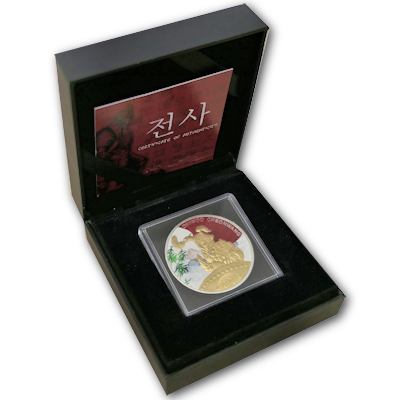 Es handelt sich hier um die Kleinauflage von nur 100 Stück weltweit in hervorragender Colorierung und Vergoldung. Diese wunderschön gestaltete Silbermünze kommt aus Südkorea und zeigt als Motiv einen historischen Krieger. Betitelt ist das Motiv mit Chiwoo Cheonwang und es handelt sich hier um die 6. Ausgabe der Serie. Das Ausgabeland ist Südkorea, produziert wird die Münze von der staatlichen Korea Minting and Security Printing Cooperation (KOMSCO).
