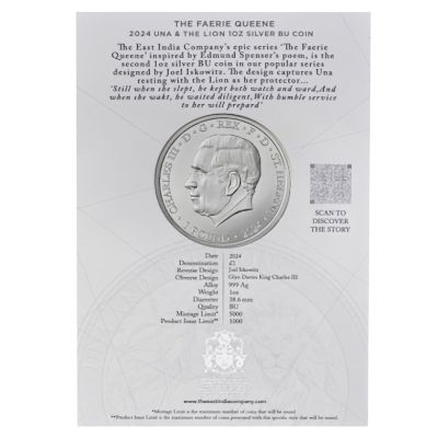 Es handelt sich hier um die 2024er Ausgabe der Serie Una and the Lion. Die Münze besteht aus 1 Oz Feinsilber in Stempelglanz BU. Die Blister-Verpackung und ist auf 1.000 Stück weltweit streng limitiert.