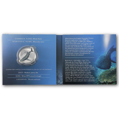 Es handelt sich bei dieser wunderschönen Münze um die zweite Ausgabe der Serie und zeigt den Walhai (Whale Shark). Die Seriennummer ist direkt auf die Münze graviert. Die Auslieferung erfolgt im Original-Blister.