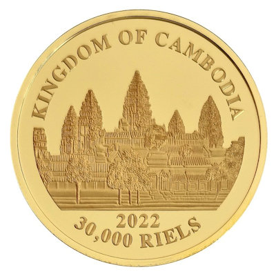 Technische Daten: Ausgabeland: Kambodscha Prägeanstalt: Ausgabejahr: 2022 Nennwert: 30.000 Riels KHR Material: Gold Gewicht: 31,10300g Durchmesser: 33 mm Dicke: 2,45 mm Auflage: 100 Stück Prägequalität: Stempelglanz Verpackung: Einzeln gekapselt |