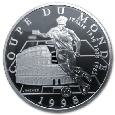 Anlässlich der Fussballweltmeisterschaft die 1998 vom Gastgeberland Frankreich ausgerichtet wurde verausgabte die Monnaie de Paris diverse Silbermünzen in der höchsten Prägequalität Polierte Platte zur Würdigung der Teilnehmerländer. Bei dieser Ausgabe wird Italien präsentiert.