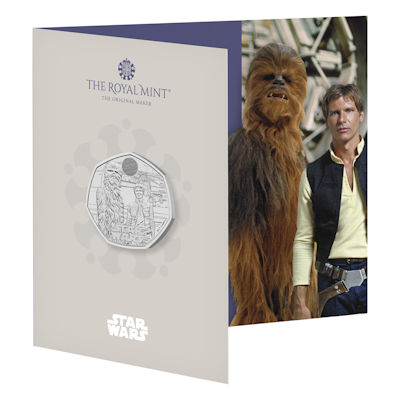 Dies ist die vierte Star Wars(TM) Ausgabe der Royal Mint. Die 8g Kupfer Nickel Münze zeigt Han Solo und Chewbacca.