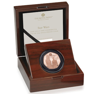 Dies ist die vierte Star Wars(TM) Ausgabe der Royal Mint. Die 1/2 Oz Feingoldmünze zeigt Han Solo und Chewbacca.