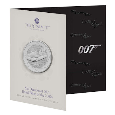 Dies ist die fünfte Ausgabe einer Serie der Royal Mint, die das bleibende Vermächtnis von James Bond feiert, Six Decades of 007. Diese Münzenserie zeigt jeweils eine ikonische Szene von Bond Filmen, die aus jedem Jahrzehnt ausgewählt wurde. Das fünfte Design zeigt das Hovercraft aus dem Film Stirb an einem anderen Tag mit Pierce Brosnans aus dem Jahr 2002.