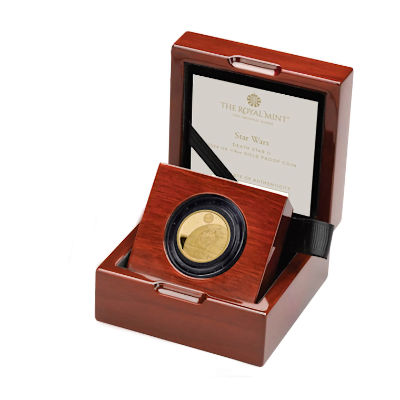 Dies ist eine neue Star Wars(TM) Ausgabe der Royal Mint. Die 1/4 Oz Feingoldmünze zeigt den Todesstern (Death Star).