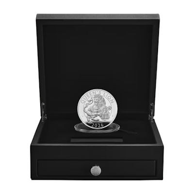 Es handelt sich hier um die 8. Ausgabe der Serie Tudor Beasts mit dem Motiv Queen`s Lion. Die Münze besteht aus 10 Oz Feinsilber in Polierter Platte.