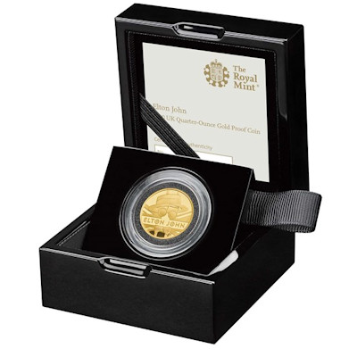 In der Münzserie Music Legends verausgabt die The Royal Mint als 2. Ausgabe Elton John. Es handelt sich hier um die Ausgabe in 1/4 Oz Feingold, limitiert auf nur 1.000 Stück weltweit. Die Auslieferung erfolgt gekapselt im Original-Etui mit nummeriertem Echtheitszertifikat. Die Münze ist bei der Royal Mint innerhalb kürzester Zeit ausverkauft gewesen!