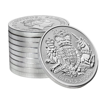 Diese Silbermünze aus der Royal Mint zeigt das Wappen Royal Arms, ein Symbol der Stärke und der illustren Geschichte der Monarchie und der Heraldik im Vereinigten Königreich. Die Royal Arms sind für jedermann im Vereinigten Königreich ein vertrautes Bild und erscheinen auf 1-Pfund-Münzen und allen offiziellen Regierungsdokumenten, einschließlich Pässen.