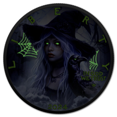 | <<< USA - 1 USD Silver Eagle: Halloween Hexenzauber 2024 - 1 Oz Silber Color Glow-in-the-Dark | |