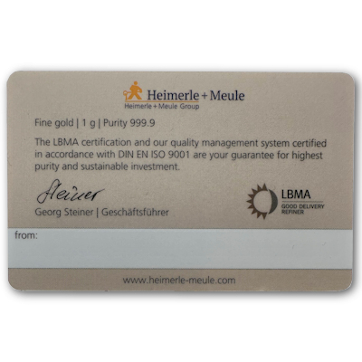 Diese FineCard von Heimerle + Meule beinhaltet einen 1 Gramm schweren 999,9er Feingoldbarren und trägt die Aufschrift Gute Besserung. Auf der Rückseite besteht zudem die Möglichkeit noch etwas zu schreiben, zum Beispiel von wem der Barren geschenkt wurde. Ein kleines golden strahlendes Kuvert rundet dieses wertvolle Geschenk perfekt ab.