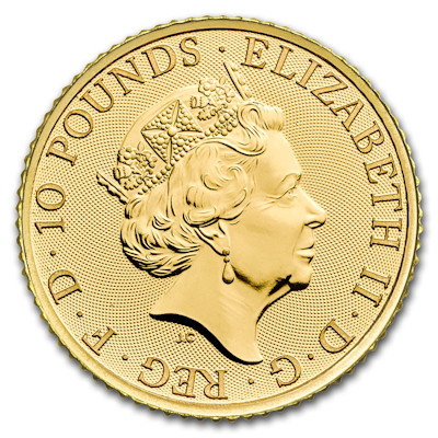 Es handelt sich hier um die beliebte Royal Arms Münzausgabe der königlichen Prägeanstalt The Royal Mint aus Großbritannien in 1/10 Oz Feingold.
