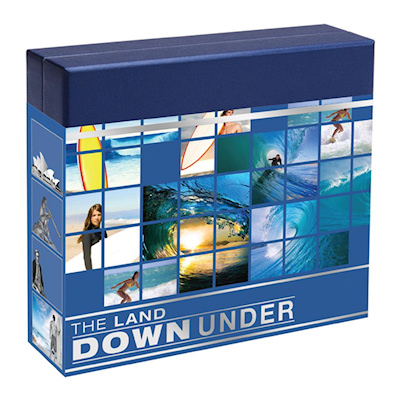 Die 4. und letzte Ausgabe in 2013 aus der Serie Land Down Under zeigt einen Surfer mit Surfbrett, eine typische Sportart die eingefleischte mit dem Kontinent Down Under verbinden. Die Münze zeigt im Hintergrund das schäumende Meer, wie immer eingerahmt in die Umrisse des Australischen Kontinents. Die in höchster Prägequalität Polierte Platte produzierte Münze kommt im Schweberahmen, der die Form Australiens hat.