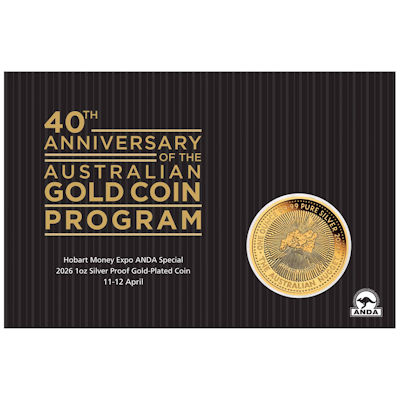 Diese bemerkenswerte 1 Oz Feinsilbermünze mit kompletter Vergoldung, erinnert an den 40. Jahrestag des Australian Nugget Coin Program der Perth Mint und wurde anlässlich der Münzmesse in Hobart 2026 ausgegeben.