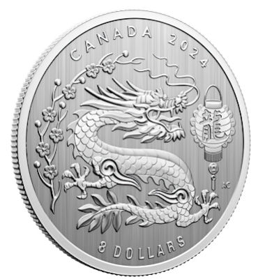 Es handelt sich hier um die Ausgabe zum Jahr des Drachen (2024) mit einem Nennwert von 8 CAD. Die Münze besteht aus gut 1/4 Oz Feinsilber in der Reinheit 99,99% und wird im Originalfolder der Royal Canadian Mint ausgeliefert. Diese Ausgabe ist auf weltweit 38.888 Stück limitiert.