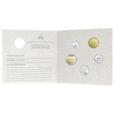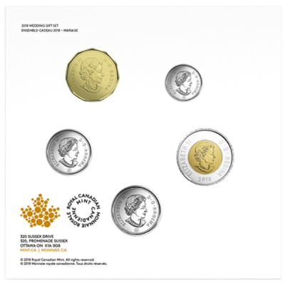 Dieser speziell zur Hochzeit ausgegebene Kursmünzensatz der Royal Canadian Mint beinhaltet eine 2 Dollar, 1 Dollar, 25 Cent, 10 Cent und 5 Cent Kursmünze im wunderschön gestalteten Blister verpackt. Die 1 Dollar Ausgabe wurde speziell für diesen Satz geprägt und ist nur in diesem Satz erhältlich.