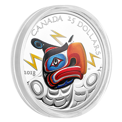 Diese Silbermünze der Royal Canadian Mint zeigt den Thunderbird in einer Ultra High Relief Prägung und zudem aufwendig coloriert. Die Münze besteht aus 1 Oz Feinsilber in der höchsten Prägequalität Polierte Platte und ist auf nur 5.000 Stück weltweit streng limitiert. Die Auslieferung erfolgt im Original-Etui mit Umverpackung und nummeriertem Echtheitszertifikat.