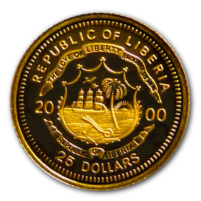 Technische Daten: Ausgabeland: Liberia Prägeanstalt: Diverse Ausgabejahr: 2000 Nennwert: 25 Dollar Material: Gold Gewicht: 0,73000g Durchmesser: 11,00 mm Prägequalität: Polierte Platte (Proof) Verpackung: Gekapselt |