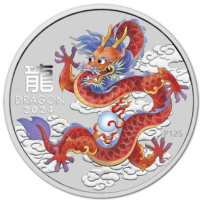 <<< Australien - 1 AUD Lunar III Drache ROT 2024 - 1 Oz Silber BU Color | |