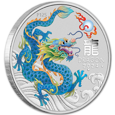 Von der PerthMint Australia kommt die Lunar III Ausgabe mit dem Motiv des Drachen in 1 Oz Feinsilber in der Prägequalität Stempelglanz, aufwendig coloriert in der Farbe Blaugrün (Teal). Die Münze wird einzeln gekapselt ausgeliefert.