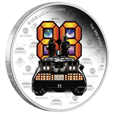 Die von den Universal Studios offiziell lizenzierte Münze ist in der höchsten Prägequalität Polierte Platte aus 10 Oz 999er Feinsilber geprägt und zudem aufwendig coloriert. Die Münze zeigt das Nummernschild des weltbekannten DeLorean.