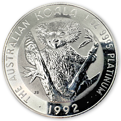 Die 1992er Ausgabe des 1 Oz Platin Koalas von der PerthMint Australia. |