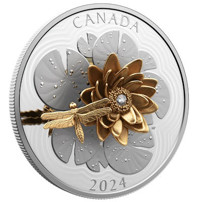 <<< Kanada - 50 CAD Libelle und Blüte 2024 - 5 Oz Silber PP Gilded | |