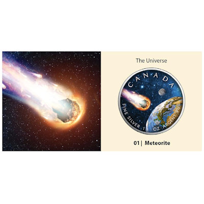 Nach dem großen Erfolg der Maple Leaf Serie Sonnensystem erscheint nun 2023 die neue Serie Maple Leaf Universum. Wie in der Sonnensystem Serie handelt es sich um colorierte 1 Oz Maple Leaf Silbermünzen die gekapselt mit Produktkarte ausgeliefert werden. Thematisiert werden dieses Mal nicht die Planeten sondern Objekte des Universums wie Meteoriten, Schwarze Löcher, usw. Die Auflage beträgt jeweils nur 2.500 Stück pro Ausgabe.