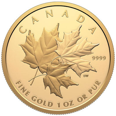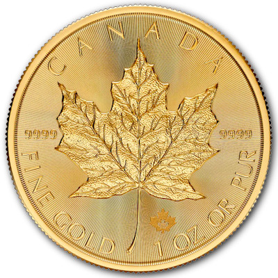Die berühmte Maple Leaf Goldmünze geprägt von der Royal Canadian Mint (Kanada) mit einem Feingewicht von 1 Gramm in der hohen Reinheit 99,99%. |