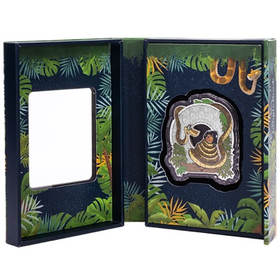 Diese 1 Oz Feinsilbermünze von Disney(TM) ist dem Klassiker Dschungelbuch(TM) gewidmet und zeigt das Motiv Schlange Kaa(TM) mit Mogli(TM). Die Münze kommt in Antik Finish mit aufwendiger Kolorierung.