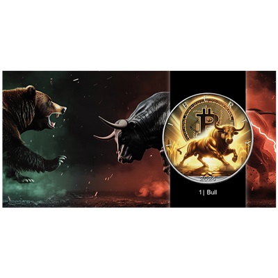 Diese wunderschöne Silberausgabe ist der Krypto Währung Bitcoin gewidmet. Der Bulle im Vordergrund steht an den Börsen für einen Bullenmarkt und somit für steigende Kurse.