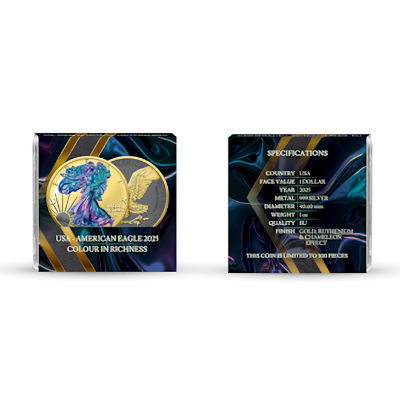 Technische Daten: Ausgabeland: USA Prägeanstalt: The United States Mint Ausgabejahr: 2025 Nennwert: 1 USD Material: Silber Gewicht: 31,10300g Durchmesser: 40,60 mm Dicke: 2,98 mm Auflage: 300 Stück Prägequalität: Stempelglanz, coloriert, vergoldet, Ruthenium veredelt, Chamäleon Effekt Verpackung: gekapselt im Original Etui mit Echtheitszertifikat |